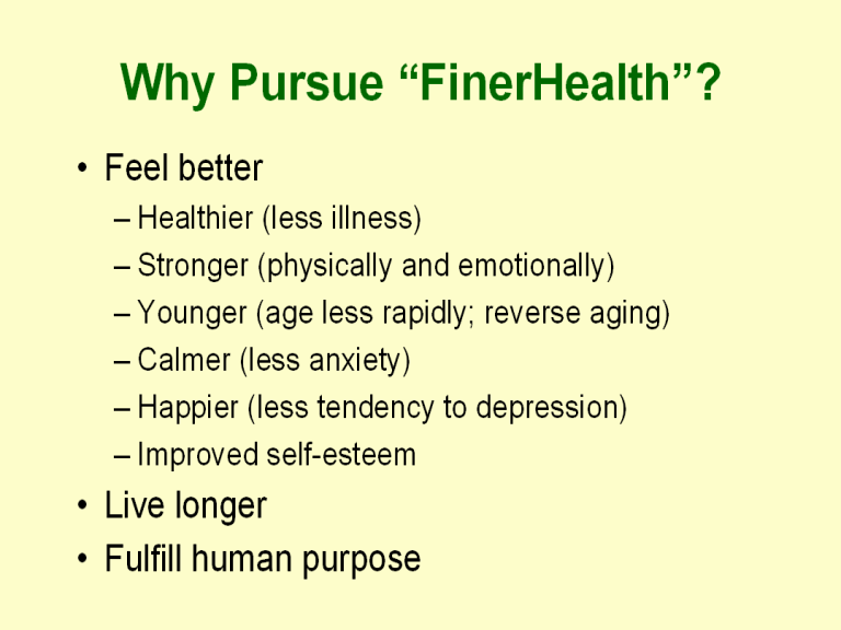Why pursue health? This is sort of an oxymoron, maybe, for why would anybody not? Certainly to feel better. We all want to feel well, and feel better, especially when we're not feeling our best. Pursuing deliberate steps for better health will certainly make you healthier. It will make you stronger, not just physically but emotionally as well. It'll make you feel younger in the sense that you'll age less rapidly, and there are even some things in the aging process that can be reversed. You'll be calmer, as you won't have to deal with the stress of illness or worry about becoming ill. You'll be happier as you'll have less tendency to depression. I think that everybody admits or knows that chronic illness and even acute illness to some extent is associated with depression. And finally, improved self esteem comes from a healthier feeling body. Everybody seems to want to live longer; that's something that health brings. And, in a more spiritual sense, it's my opinion that it is part of the purpose of our human existence to keep our bodies healthy. You can even think that we are borrowing these bodies, that our lives are on loan from some greater being or some greater place and it's really our duty to maintain the body as best that we can.