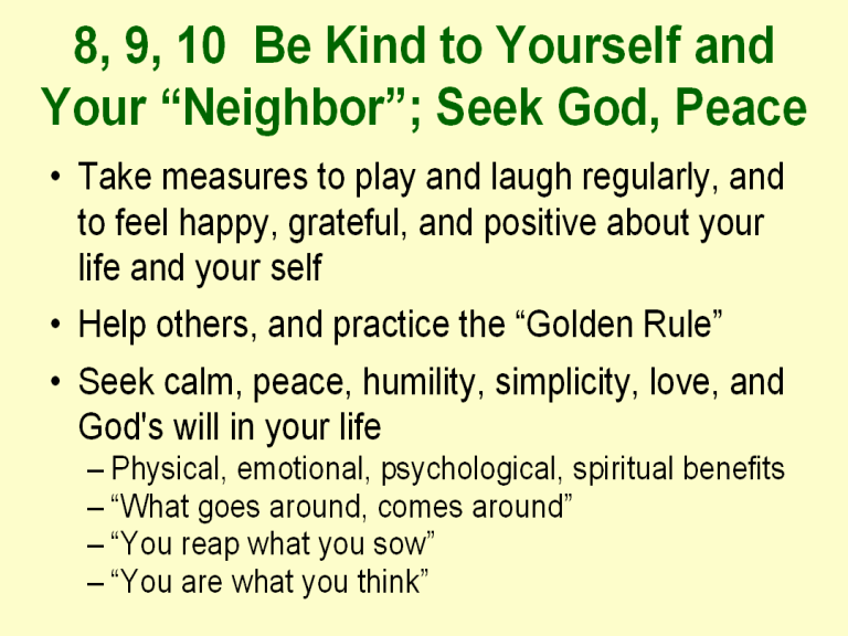 This step relates to the spiritual side of health; the less tangible and less fact-related side if you will. Take measures to play and laugh regularly. Feel happy, grateful, and positive about your life and yourself. Why do we need to laugh? What is the good thing about laughter? It makes you feel good. It keeps you from being depressed. It actually helps your immune system. It keeps you from getting sick. It may cure cancer. If you want positivity in your life, you have to be a positive person. Your consciousness brings reality to your life. Reality is only how our mind filters and perceives reality.